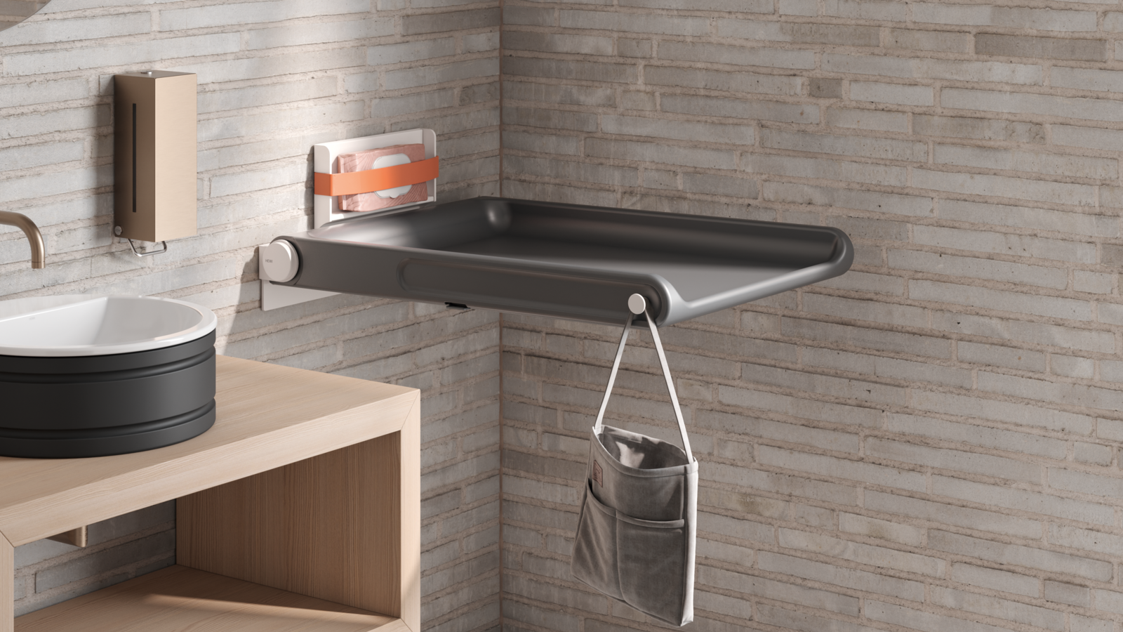 Der Wickeltisch von HEWI verwendet eine PUR-Liegefläche mit antibakteriellen Eigenschaften und bietet durch verdeckte Befestigung eine ansprechende und hygienische Lösung. Integrierte Haken und ein Klemmfach sorgen für zusätzlichen Bedienkomfort