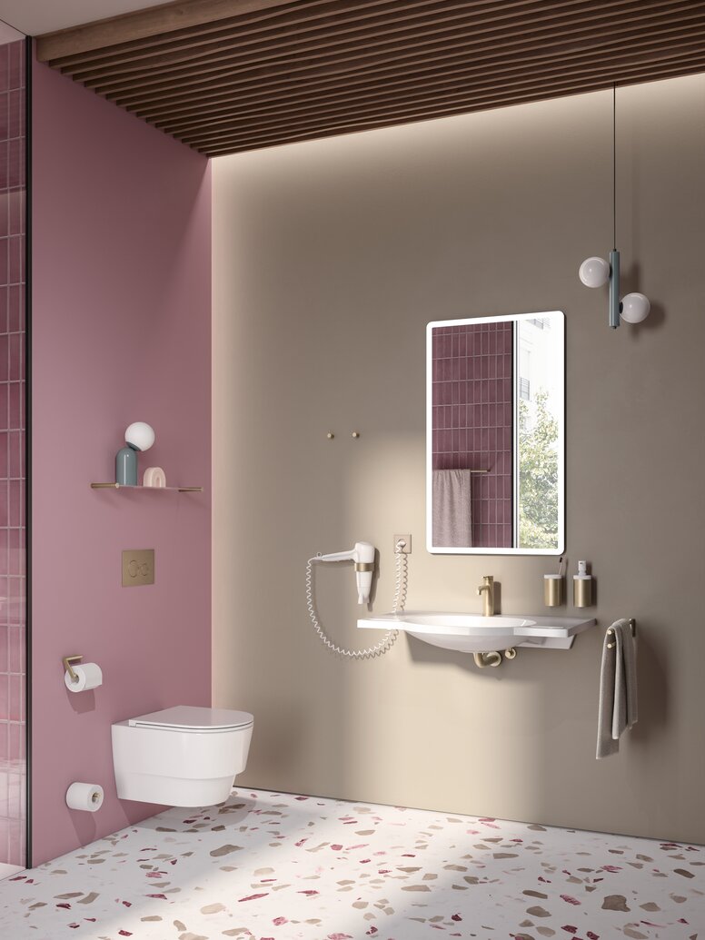 More glamour in the bathroom: Brass, bronze or gold are just some of the new metallic designer surfaces from HEWI that can be used to transform contemporary sanitary rooms into personalised oases of well-being – be it in hotels, in representative public buildings, in elective surgery areas in hospitals or in the bathroom at home. Altogether, the manufacturer is offering five colours in either brushed or glossy finishes for its accessible sanitaryware and accessories, all manufactured in the PVD process. This allows for even more diversity and scope for bathroom planning.