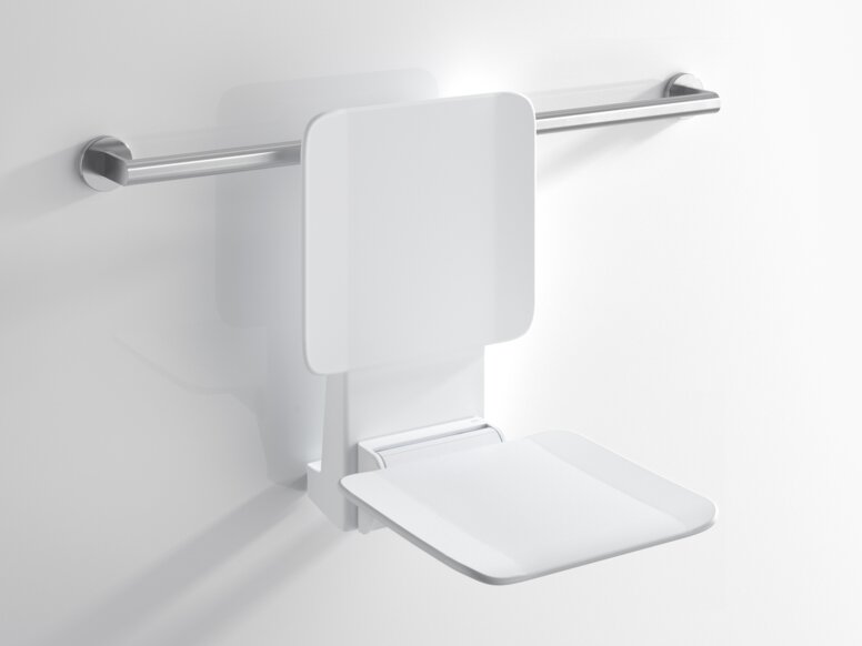 Grâce au siège mobile, l'équipement de douche peut être conçu de manière flexible. Le siège de douche mobile est simplement encliqueté dans la plaque de montage installée de façon permanente lorsque cela est nécessaire.