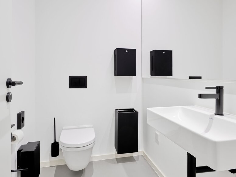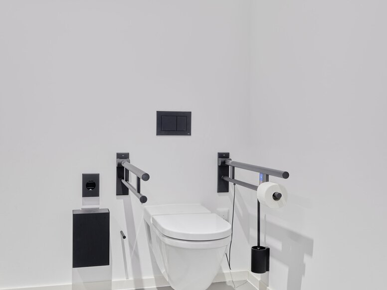 HEWI System 900 oferuje szeroką gamę bezproblemowo łączonych produktów do pomieszczeń sanitarnych, w tym do WC bez barier w Firner Trautwein. Ciemna kolorystyka akcesoriów łazienkowych jest tu równie konsekwentna, jak w innych obszarach.