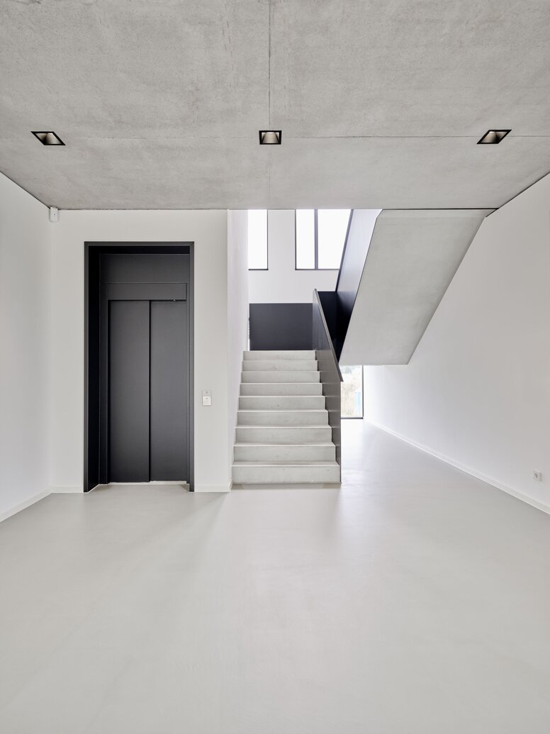 Żadnych niepokojów: Odsłonięty beton i designerski wygląd posadzki o wyglądzie betonu tworzą jednolity, przejściowy wygląd budynku administracyjnego.